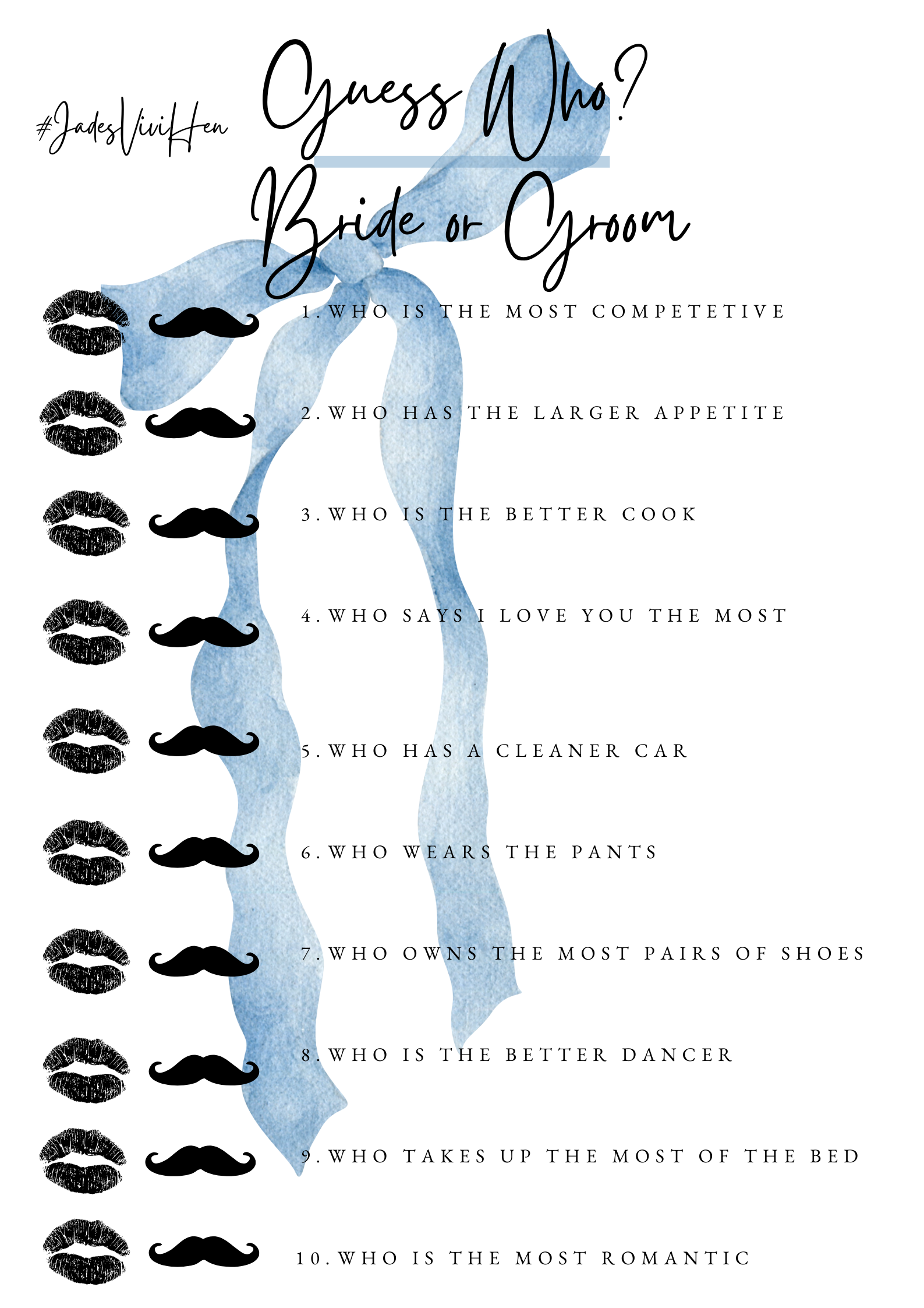 Welcome to the heart of the fun! Get ready for a relaxed and memorable time with our specially curated games and activities, all themed around our beautiful bride, Jade. Dive into a collection of laughter, friendly competition, and unique moments designed just for Jades Hen Do. Let the good times roll!