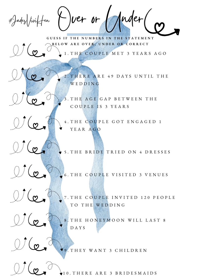 Think you know Jade's life story in numbers? Our "Over or Under" game is here to find out! We'll give you a statement containing a number related to Jade – maybe her age or when she first met Aaron, the number of countries she's visited, or how many shoes she owns! Your task is to guess if the actual number is over, under, or exactly correct. It’s a hilarious and relaxed way to uncover fun facts about our bride-to-be. Guess wisely to score points and prove your ultimate friendship!