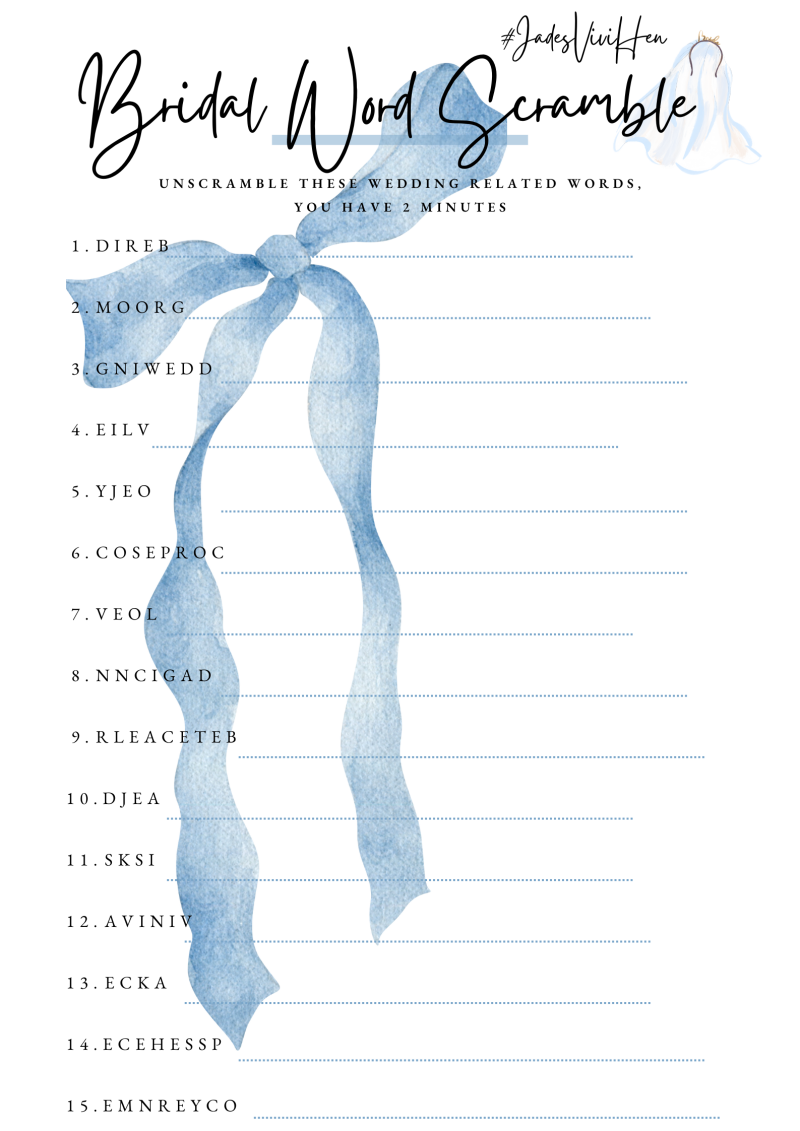 Bridal Word Scramble is a quick and fun game that puts your wedding knowledge to the test! Below is a list of wedding-themed words with the letters mixed up and you must race to unscramble them correctly before time runs out. The person with the most correct answers wins!